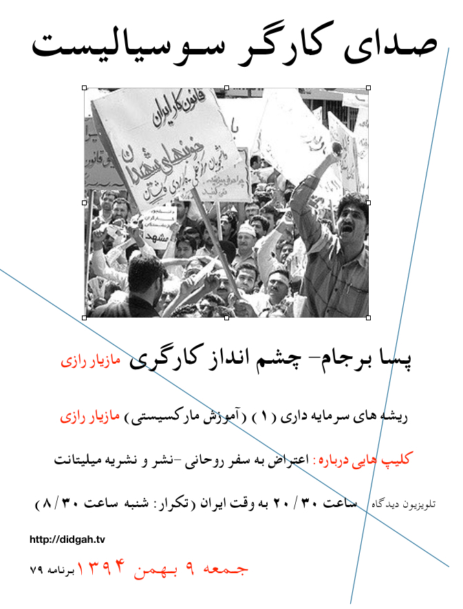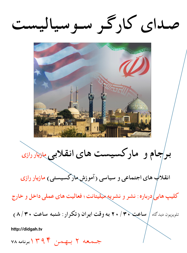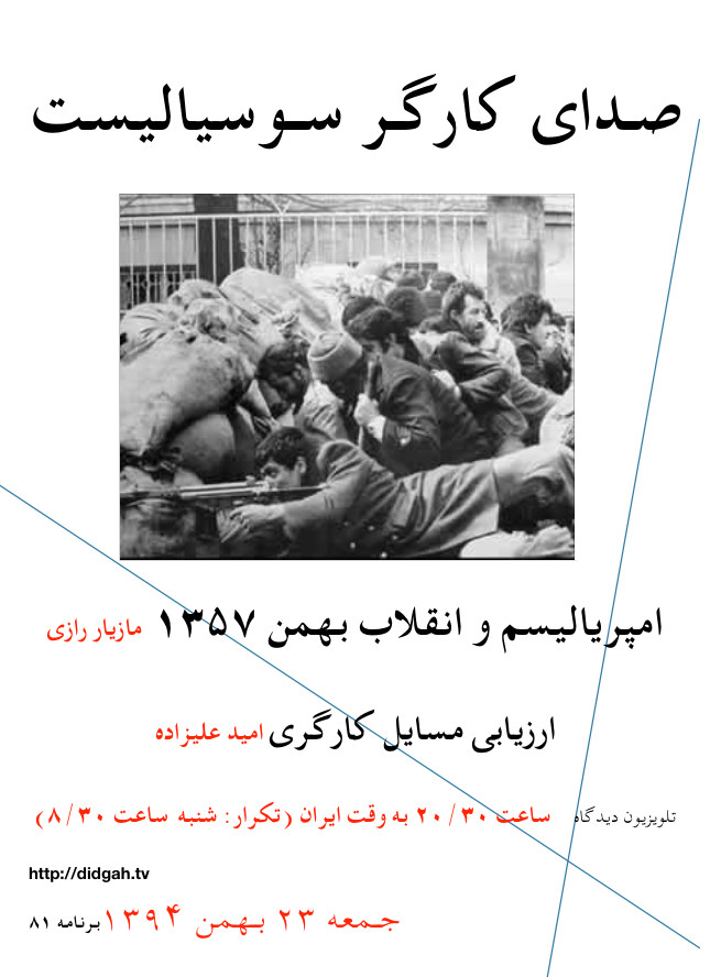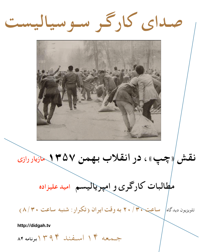 صدای کارگر سوسیالیست ،برنامه۸۴-۱۴ اسفند ۹۴ – تلویزیون دیدگاه رو به ایران این برنامه شامل: درس های انقلاب ۱۳۵۷ بهمن (۳) و نقش چپ – مازیار رازی مطالبات کارگری و امپریالیسم – امید علیزاده...