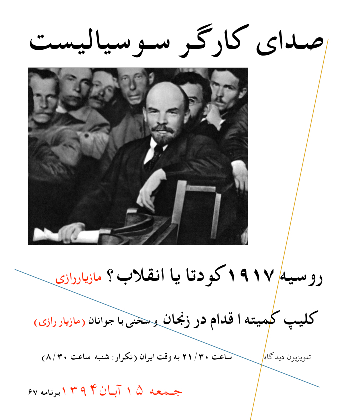 صدای کارگر سوسیالیست ،برنامه ۶۷ ۱۵ آبان ۹۴ -، تلویزیون دیدگاه رو به ایران این برنامه شامل: سالکرد انقلاب اکتبر ۱۹۱۷ روسیه ۴- انقلاب روسیه کودتا یا انقلاب؟ – مازیار رازی فعالیت های عملی...