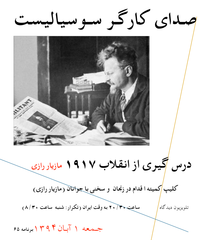 صدای کارگر سوسیالیست ،برنامه ۶۵ ۱ آبان -، تلویزیون دیدگاه رو به ایران این برنامه شامل: سالکرد انقلاب اکتبر ۱۹۱۷ روسیه ۲-استراتژی – مازیار رازی فعالیت های عملی ایران سخنی با جوانان: فعالیت مخفی...