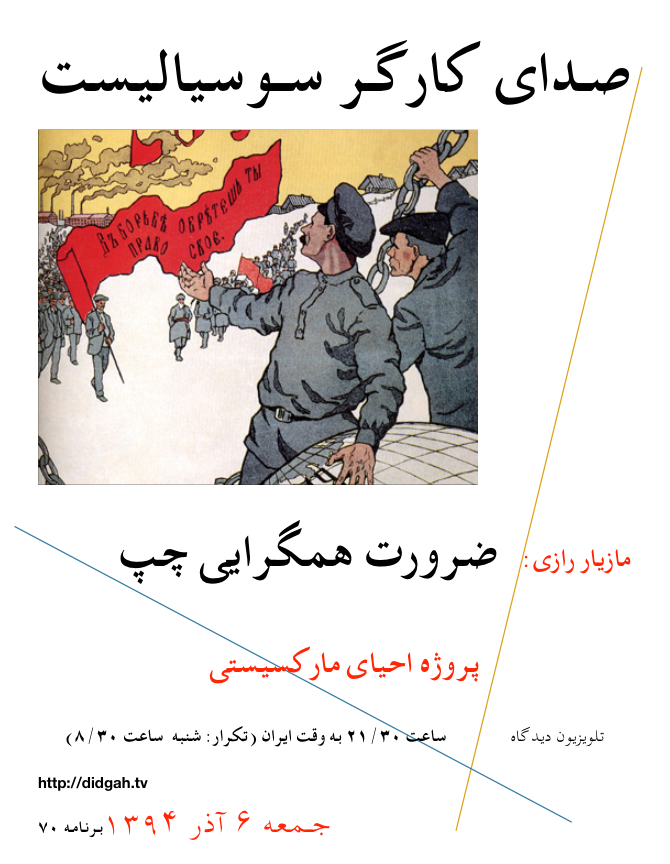صدای کارگر سوسیالیست ،برنامه ۷۰ – ۶ آذر ۹۴ – تلویزیون دیدگاه رو به ایران این برنامه شامل: خاور میانه و همگرایی چپ (مازیار رازی) کلیپ احیای مارکسیستی ۲ – علیرضا بیانی: پاسخ به...