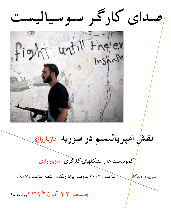 صدای کارگر سوسیالیست ،برنامه ۶۸ ۲۲ آبان ۹۴ – تلویزیون دیدگاه رو به ایران این برنامه شامل: امپریالیسم و سوریه – مازیار رازی فعالیت های عملی ایران سخنی با جوانان ۴: روش حزب سازی...